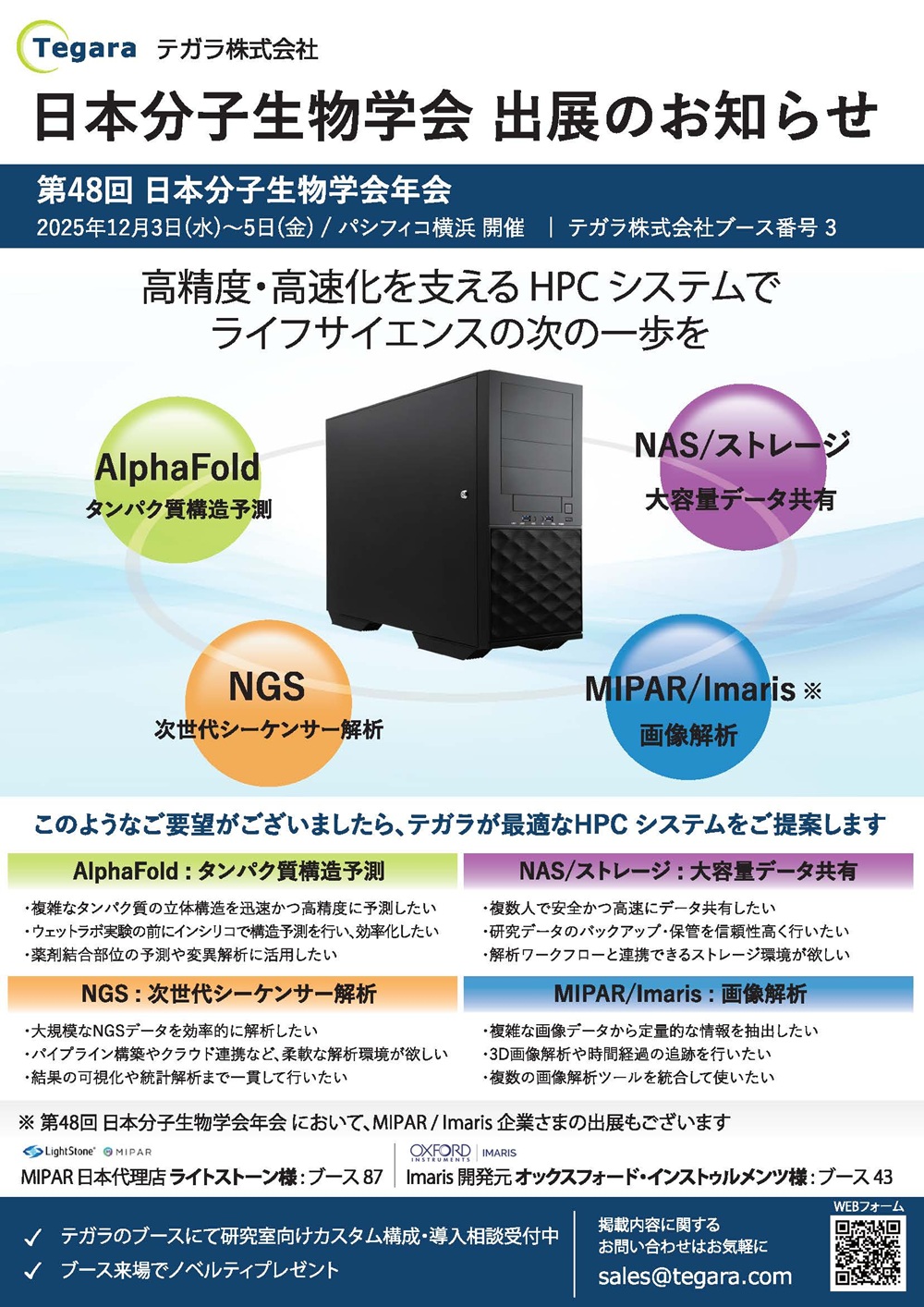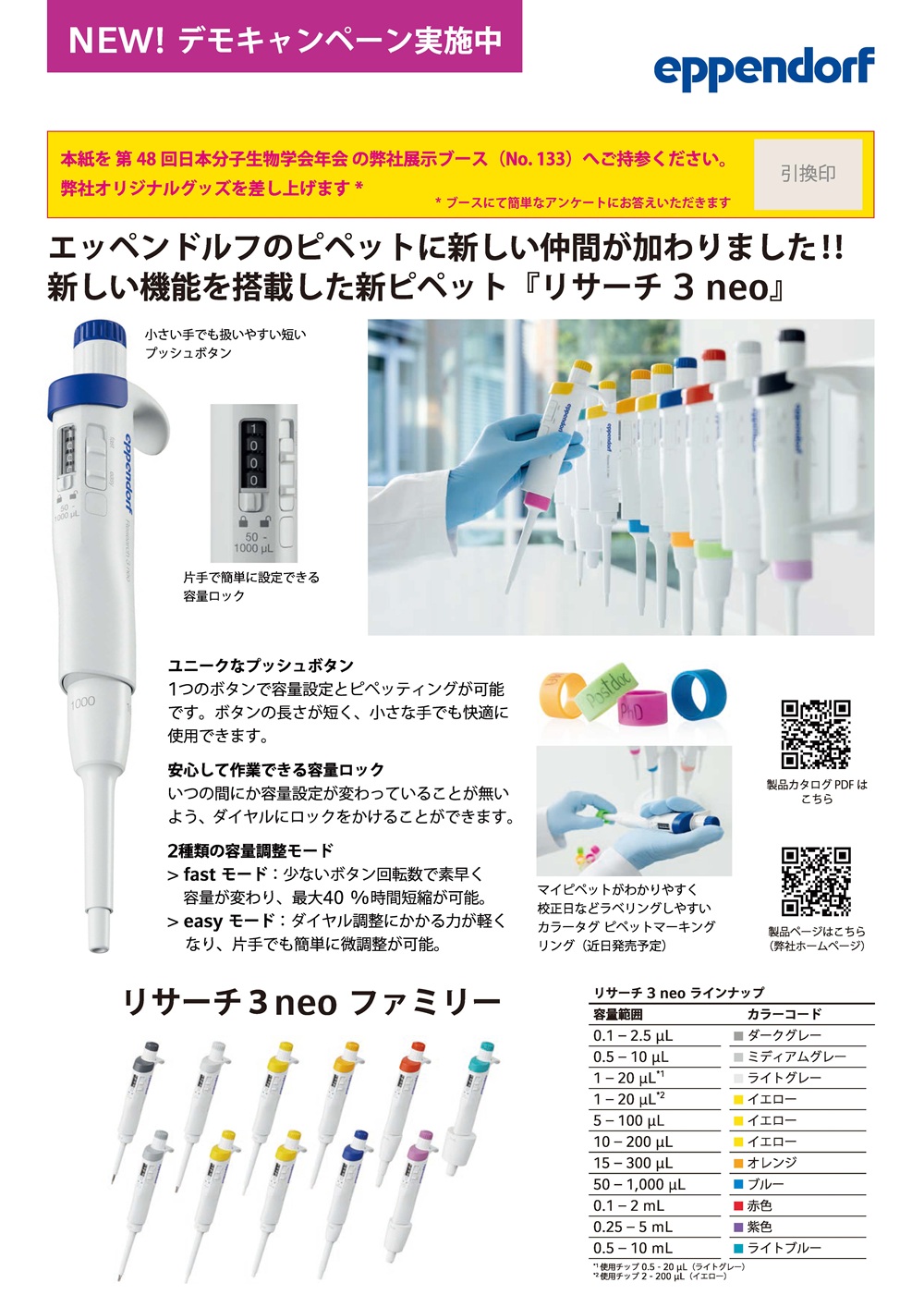 | 第48回日本分子生物学会年会に出展いたします。ご来場の際は是非お立ち寄りください。 ◆ 第48回 日本分子生物学会年会 ◆ 会期:12/3(水)~12/5(金) 時間:11:00~19:00 会場:パシフィコ横浜 ブースNo.:B05 |