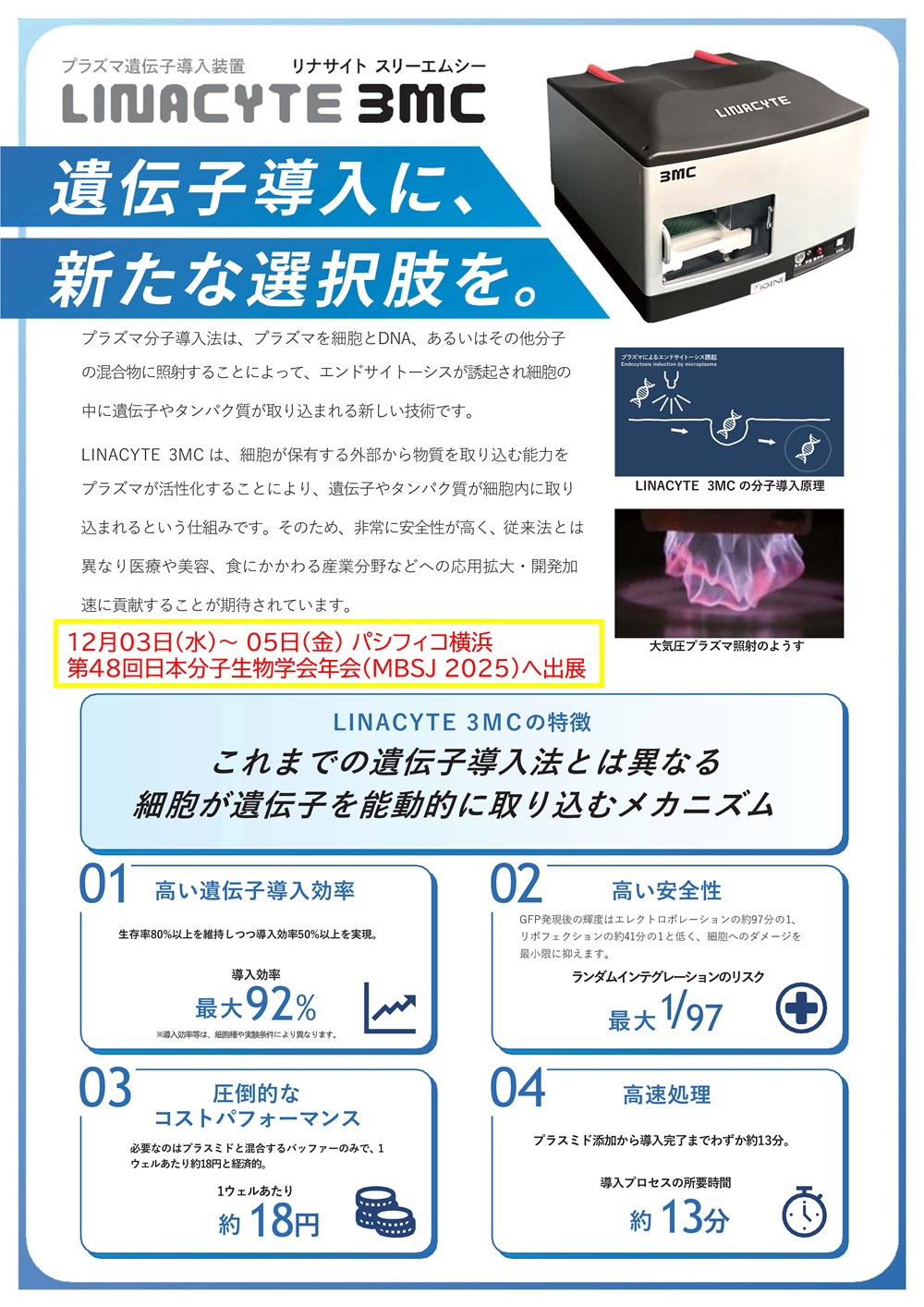 | 第48回日本分子生物学会年会に出展いたします。ご来場の際は是非お立ち寄りください。 ◆ 第48回 日本分子生物学会年会 ◆ 会期:12/3(水)~12/5(金) 時間:11:00~19:00 会場:パシフィコ横浜 ブースNo.:B05 |
